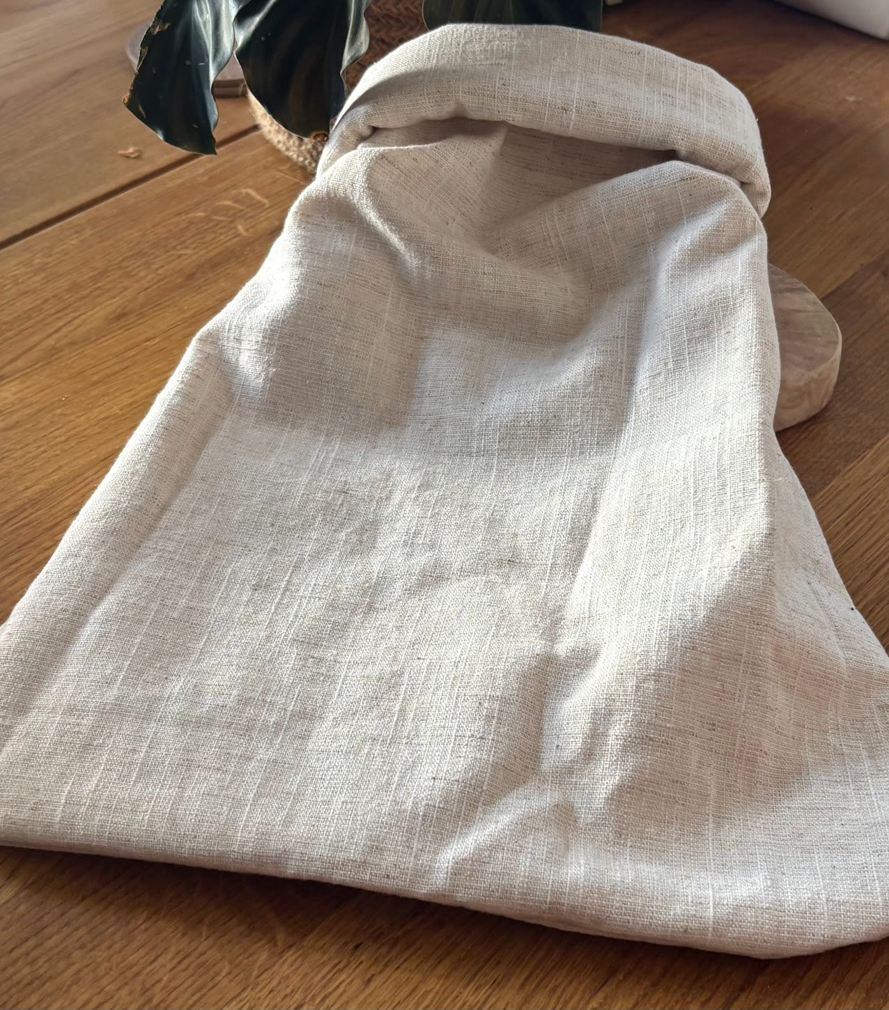 Pussi on suunniteltu kestämään aikaa ja arkea. Yksi pieni teko kohti vähemmän kertakäyttöä ja enemmän luonnollisuutta sekä kauneutta keittiössä. Toimii parhaiten tuoreelle, viipaloimattomalle leivälle.